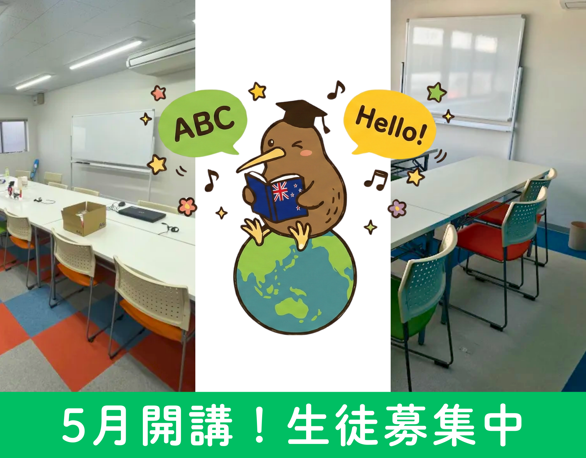 はじめての英会話は、Hello Kiwiで。お子様から大人の方まで大歓迎! 無料体験レッスン Hello Kiwi英会話の 3つの特長 教室・オンライン好きなスタイルで! 忙しい時はオンライン、しっかり学びたい時は対面など、自分に合わせて選択可能。 ニュージーランド文化に触れられる 単なる英会話だけでなく、現地の文化や習慣も学べる。 レベルに合わせた指導 初めての方でも安心。一人ひとりの目標に寄り添ったカリキュラム。 Hello Kiwiとは?? こんにちは!Hello Kiwi 英会話へようこそ。私は日本で生まれましたが、小さい頃からニュージーランドで育ちました。日本の文化とニュージーランドの文化、両方を身近に感じながら生活してきたことが、今の私の英語教育のスタイルにつながっています。 講師紹介はこちら コース紹介 小学生から大人まで学べる、選べるレッスンスタイル。チケット制なので、予定に合わせて無理なく通い続けられます。 キッズコース 対象:小学生 楽しみながら英語が自然と身につくコースです。じっくり学べるマンツーマンか、ご家族・お友達とのペアレッスンも選べます。教室でもオンラインでも、お子様のペースに合わせてスタートできます。 詳しく見る ベーシックコース 対象:中学生~大人 基礎から楽しく学べるコースです。集中できるマンツーマン、ご家族・ご友人とのペアレッスンのほか、2~4人の少人数グループレッスンも選択可能。教室・オンラインどちらも対応しており、ライフスタイルに合わせて柔軟に続けられます。 詳しく見る ベーシックコース(グループ) 対象:中学生~大人 仲間と楽しく、刺激し合いながら基礎から学べるコースです。2~4人の少人数制なので、一人ひとりがしっかり話せる時間を確保。教室・オンラインどちらも対応しており、リーズナブルに、かつモチベーションを維持しながら無理なく続けられます。 詳しく見る 少しでも気になった方はぜひLINEでご連絡ください! 無料体験をご希望の方はこちらから 無料体験レッスン